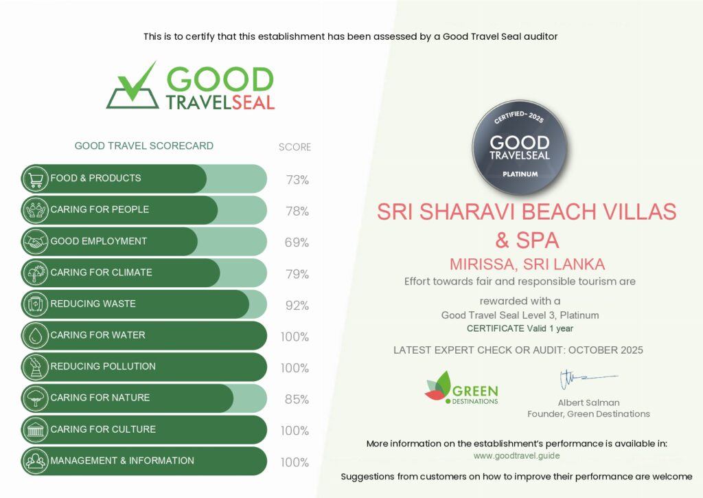 Sri Sharavi Beach Villas & Spa is a serene beachfront sanctuary on Sri Lanka’s stunning southern coast. Blending luxury, comfort, and warm hospitality, the property offers spacious villas, elegant suites, an oceanfront 43 metre saltwater infinity pool, and a tranquil spa inspired by local wellness traditions. Guests can enjoy direct beach access, personalized service, fresh gourmet cuisine, and unforgettable sunsets over the Indian Ocean. Whether you seek relaxation, romance, or a peaceful escape, Sri Sharavi Beach Villas & Spa sets the perfect backdrop for a memorable stay in Mirissa.